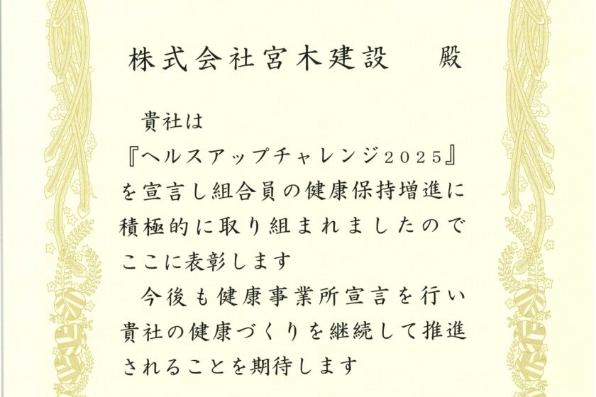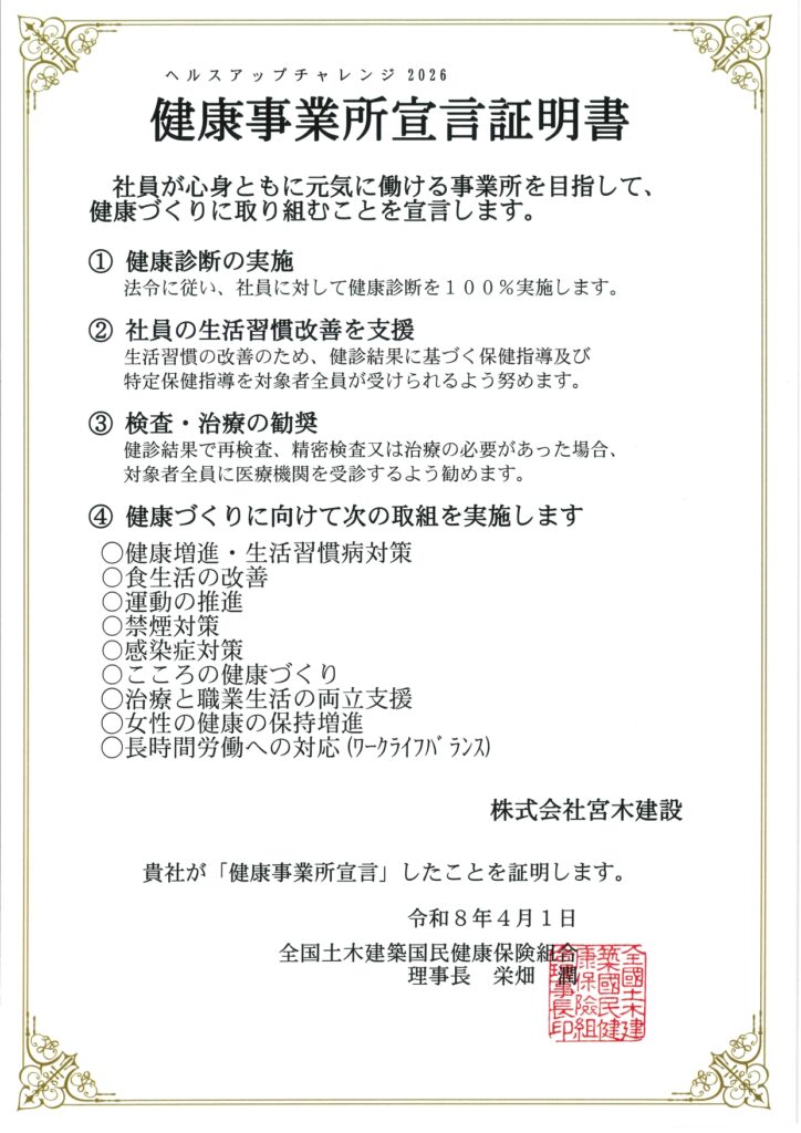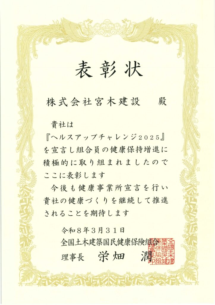 Post Share Hatena Pocket RSS feedly Pin it 記事のタイトルとURLをコピーする 全国土木建築国民健康保険組合より、健康事業所宣言証明書とヘルスアップチャレンジ2025に取り組んだ表彰状をいただきました!事務所に掲示いたします。 今年度も従業員に対して心も身体も健康増進の取り組みをしていけるよう精進してまいります。 今日の朝食 前の記事