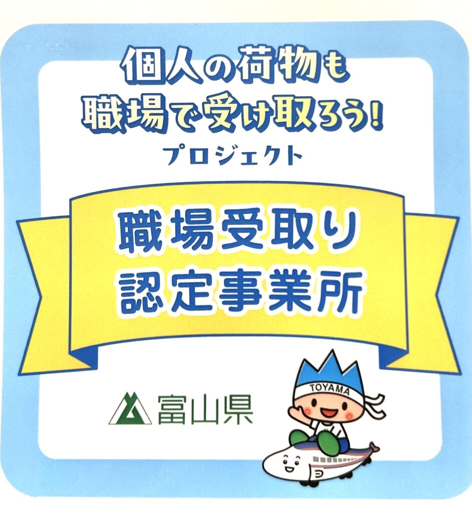 当社は以前より、富山県環境保全課の「 個人の荷物も職場で受け取ろう!プロジェクト 」に参加しています。 この度、職場受取り認定事業所のステッカーをいただきました!