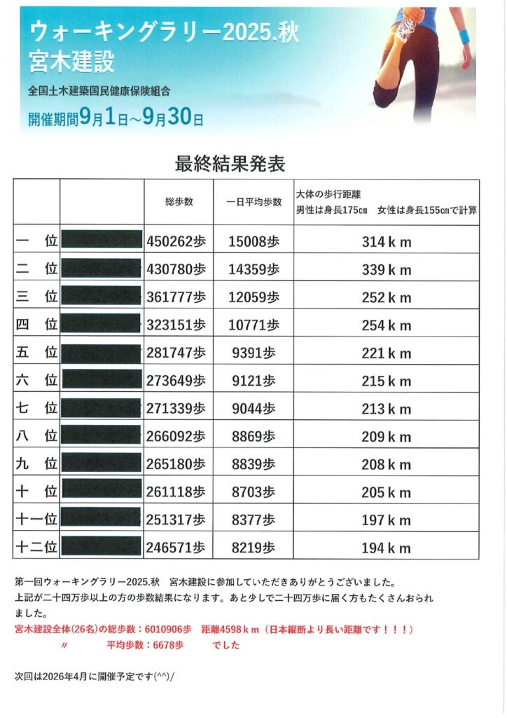 Post Share Hatena Pocket RSS feedly Pin it 記事のタイトルとURLをコピーする 上記が二十四万歩以上歩き、受賞された方々です。朝礼の時に授賞式を行い、賞状と景品をお渡ししました。 次回は2026年4月に開催予定となっております。楽しく歩いて健康づくりにこれからも力を入れて参ります(‘ω’)ノ 全国労働衛生週間の始まりと朝食提供 前の記事 MIYAKEN22号 次の記事