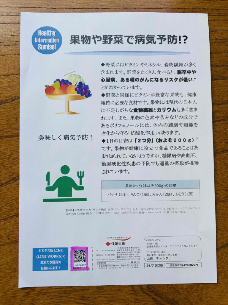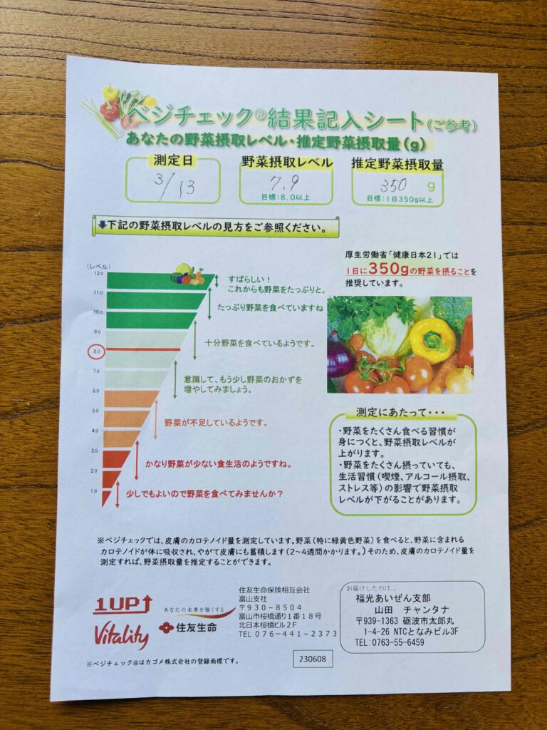 ↑最後にこのような紙をいただき野菜摂取の重要性の書いてある紙をいただき終了しました。