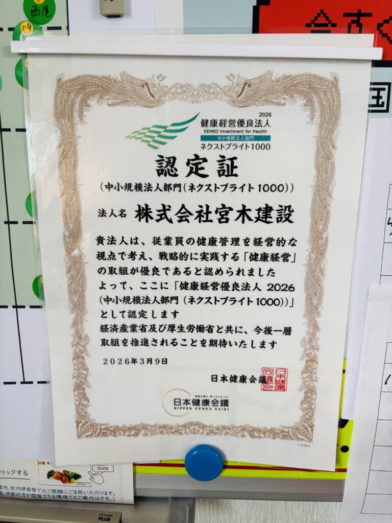 Post Share Hatena Pocket RSS feedly Pin it 記事のタイトルとURLをコピーする 健康経営優良法人2026の認定証を事務所と休憩室にそれぞれ掲示いたしました。 春休み中の子供たちの1日 前の記事