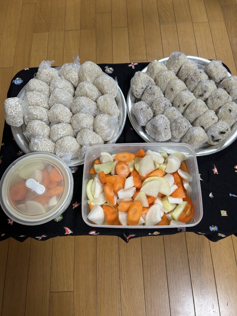 今日も玄米と白米のおにぎりにしています。ふりかけを混ぜたものと何も混ぜていないものを提供しています。