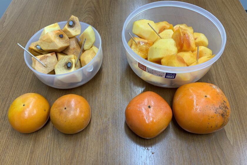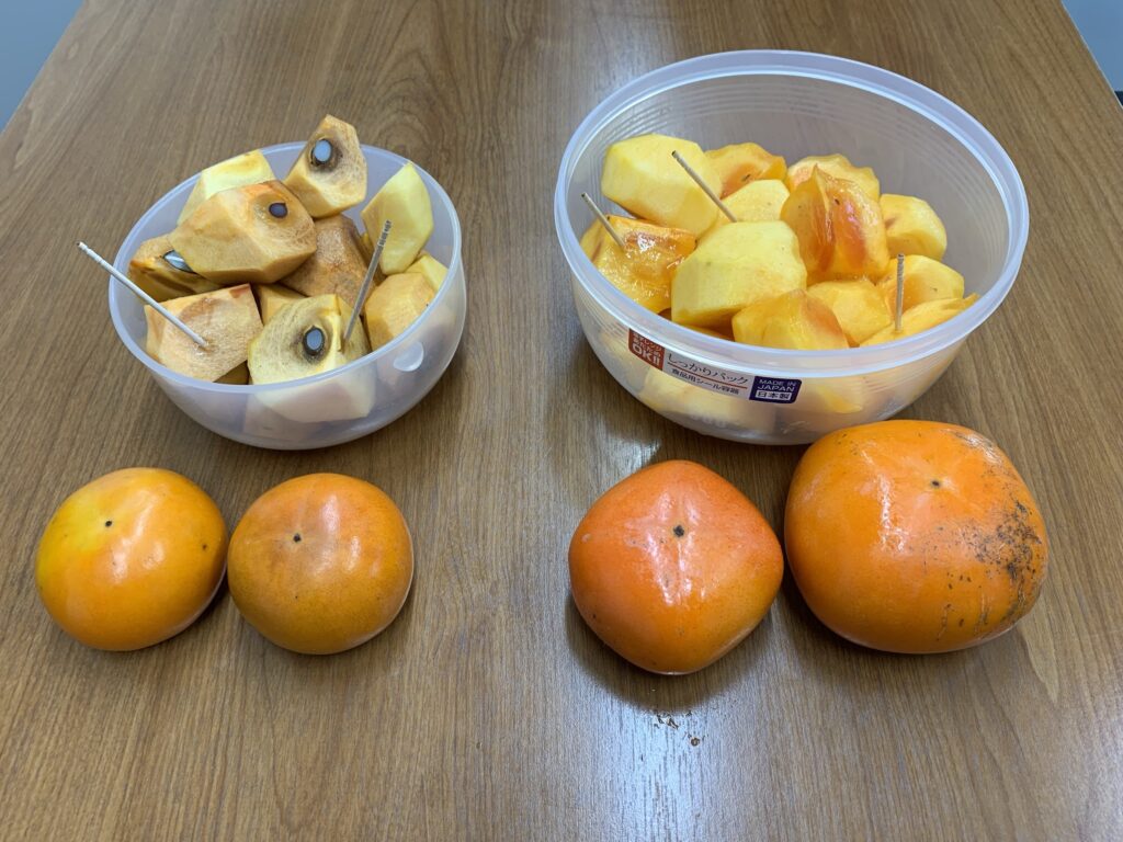 右側:砺波市栴檀山特産のふく福柿:「食べる人も作る人もみんなに福がくるように」そんな願いから命名されています。渋柿を収穫後すぐに脱渋作業をすることによって、種がなく、あっさりした上品な甘さとやや固めなジューシーな食感が特徴。当社従業員に栴檀山の方がいて持ってきてくださいました!!!