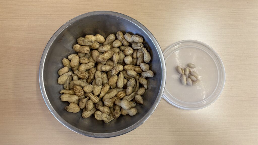 こちらは、南砺市産の落花生です。従業員の家で収穫した落花生を塩を入れてゆでたものです。右側が皮をむいたものになります。やわらかい食感になっており、塩味でとてもおいしかったです。