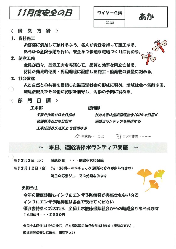 Post Share Hatena Pocket RSS feedly Pin it 記事のタイトルとURLをコピーする 11月に入り、急に冷え込んできました。 本日も朝礼後、会社周辺の道路清掃ボランティアを行いました。 それぞれの現場へ出動する前に野菜ジュースでエネルギーチャージ! 風邪をひかないように体調管理気をつけていきましょう! ウェルビーイングチャレンジ 前の記事 認定事業所ステッカーをいただきました 次の記事