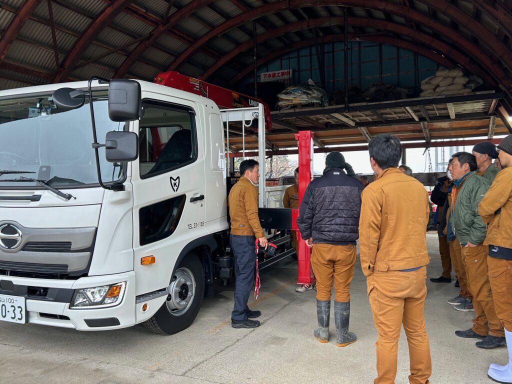 ↑先日納車した新しいユニックの説明を社長が行っている写真です。前のユニックより幅も高さもあるので、危険がないように皆さん真剣に聞いています。