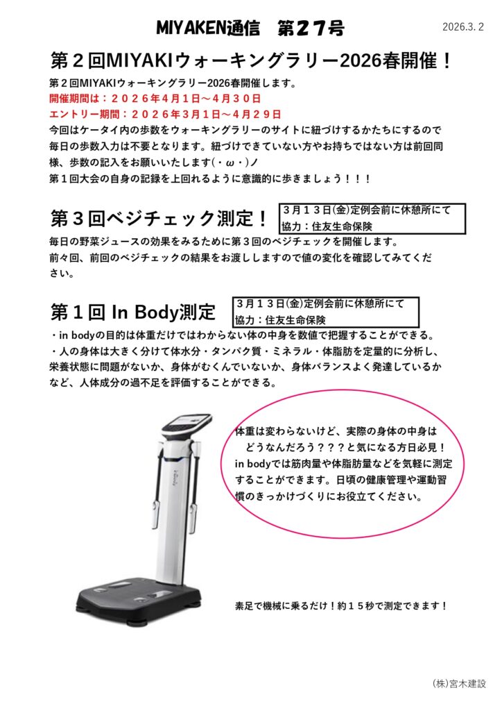 Post Share Hatena Pocket RSS feedly Pin it 記事のタイトルとURLをコピーする 来月から第2回のウォーキングラリー、今月の定例会前に第3回のベジチェックと第1回のInBodyを住友生命保険さんの協力で開催する予定になっています。 ウェルビーイングの新聞掲載 前の記事 3月度安全の日 次の記事